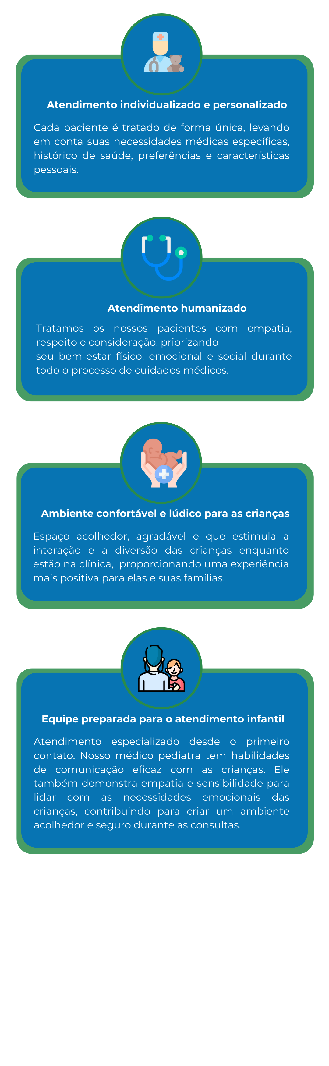 R: Optar por uma clínica pediátrica particular oferece uma série de benefícios, incluindo atenção personalizada com o médico pediatra, consultas mais longas e um ambiente acolhedor que ajuda a criança a se sentir mais confortável durante as visitas médicas.